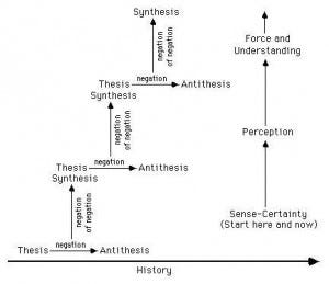 Sólo hasta que se tiene una antítesis se puede completar el ciclo de la recurrencia y este a su vez, puede ingresar a un ritmo superior que permita avanzar; este ciclo cerrado se llama síntesis. Como cuando se cambia de mala o se interpreta el siguiente compás. Sólo hasta que se cierra una idea del todo, se puede ver más allá y girar humildemente la semilla para entrar en otra. Con suerte, se podría llegar al final. Claramente a mí no se me ocurrió nada de esto, eso fueron cosas que me contaron los libros. Uno de ellos me dijo que todo este mambo con la recurrencia y los ciclos fue lo que Hegel llamó la triada dialéctica y se considera la carta de navegación de la historia: